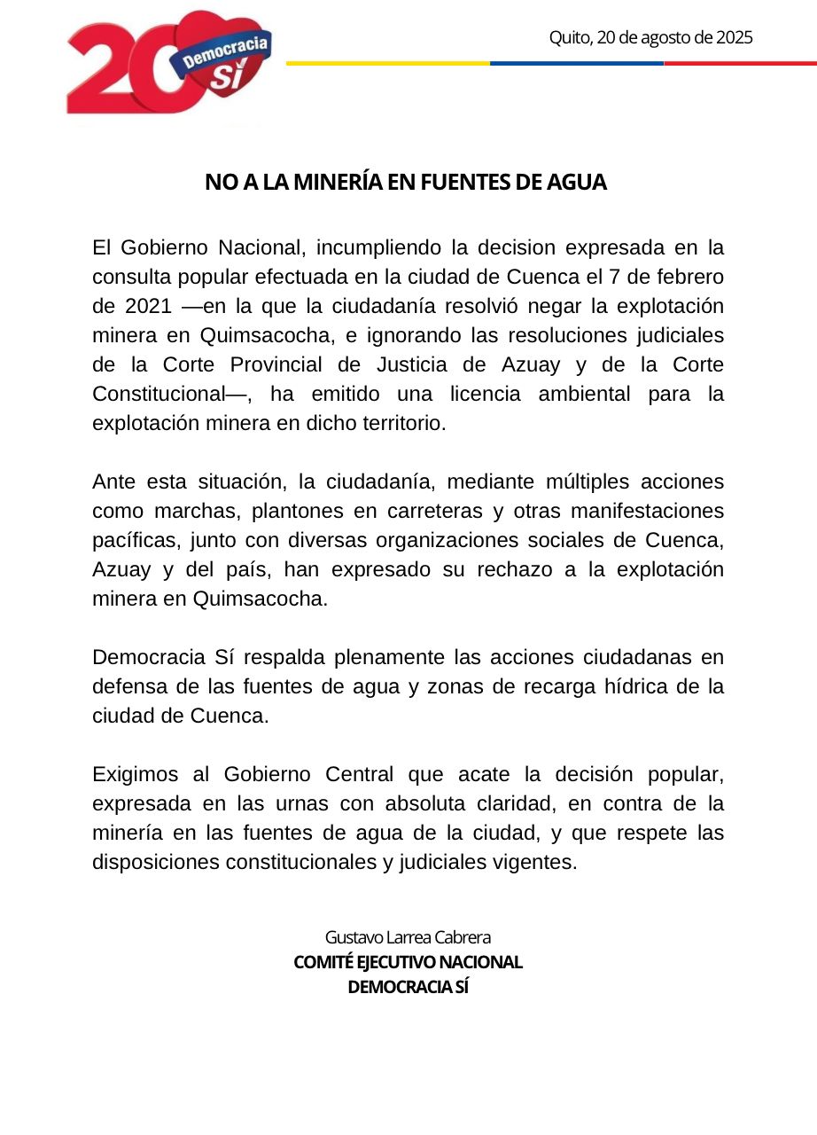 El Gobierno Nacional, incumpliendo la decision expresada en la consulta popular efectuada en la ciudad de Cuenca el 7 de febrero de 2021 —en la que la ciudadanía resolvió con más del 80% de los votos negar la explotación minera en Quimsacocha, e ignorando las resoluciones judiciales de la Corte Provincial de Justicia de Azuay y de la Corte Constitucional—, emitió una licencia ambiental para la explotación minera en dicho territorio.